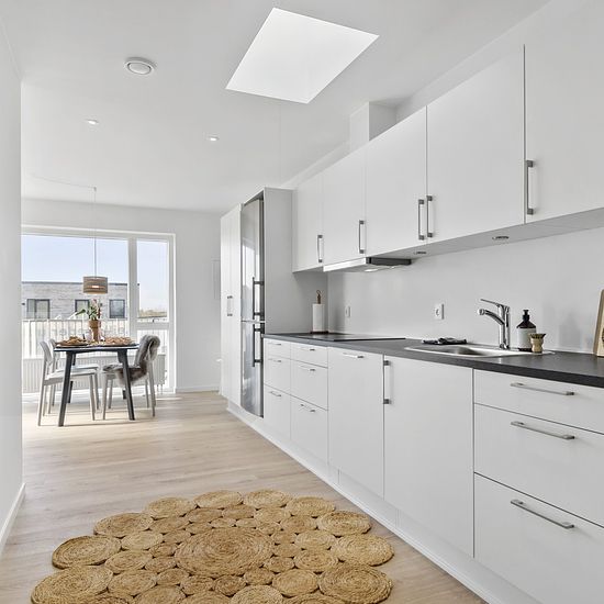 Fantastiske lyse 3-vær. lejligheder i nyopført byggeri fra 2021. Lejemålene findes både i stueplan med tilhørende hyggelig terrasse og på 1. sal med altan, begge dele vender mod syd. Lejemålene indeholder stor stue og køkken-alrum med alt i hårde hvidevarer inkl. integreret opvaskemaskine, fine hvide skabselementer fra Svane Køkken og flotte laminatgulve. De store vinduespartier fra gulv til loft sørger for et lækkert lysindfald i løbet af dagen. På badeværelset er der store grå klinker, et flot lyst badmiljø, samt installeret en kombinere...