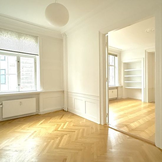 Lejligheden består af en entré og to stuer en-suite. Et stort køkken, med mulighed for en lille spiseplads, samt et badeværelse med vaskemaskine/tørretumbler. Fire soveværelser samt endnu et badeværelse med brusekabine. Ejendommen er beliggende tæt på Nyhavn, i gåafstand til Metro og Københavns mange lækre butikker og hyggelige restauranter og cafeer.
