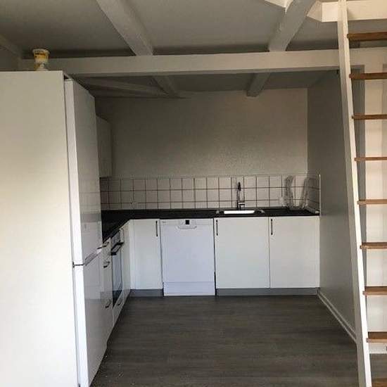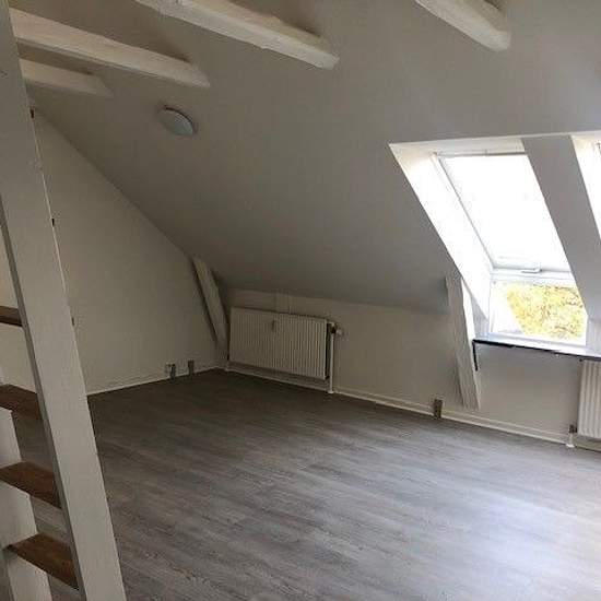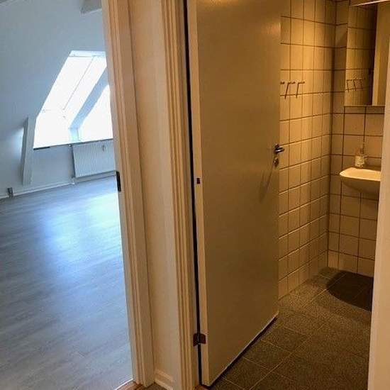 Hyggelig taglejlighed øverst oppe på 4.sal med udsigt over Odense by og Kongens Have. Der er IKKE elevator i ejendommen. Nyt køkken i åben forbindelse til stue/opholdsrum. Der er en større hems i stuen, der kan bruges til ekstra opholdsrum, opbevaring el. lign. Adgang til fælles gårdhave og fællesvaskeri i kælderen. Der hører et depotrum til lejemålet.