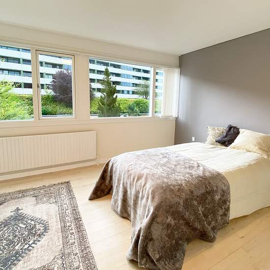 Rækkehuset ligger midt i en stor park, hvor hunde er tilladt, og som omfatter en lille legeplads lige ved siden af huset samt en smuk sø, som er beskyttet med et hegn. Parken støder op til skoven, som kan følges til de kongelige jagtmarker. Rækkehuset består af 124 kvm boligareal og 62 kvm kælder. Du har en privat gårdhave mod øst, en lille have mod vest, en carport og et skur. Huset indeholder: Entré, køkken med amerikanerkøleskab, stor stue med vindue/døre, der åbner helt op til den lille private have mod vest, gæstetoilet – 1. sal: 2-3 so...