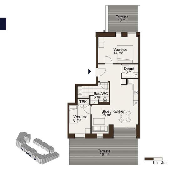 Boligen: Dejlig velindrettet 3-værelses lejlighed med stort køkken-alrum og stue med direkte udgang til stor privat terrasse. To rummelige soveværelser og et moderne badeværelse med separat brus. Fra det ene soveværelse er der desuden adgang til boligens anden terrasse. Der er direkte adgang til depotrum i lejligheden. Boligen er lys og her er kun benyttet de bedste materialer. Ydermere er der gulvvarme og genvex som sikrer et godt indeklima. Om Egedal Stationsby: Boligen ligger i en af de flotte arkitekttegnede ejendomme i Egedals nye bydel...