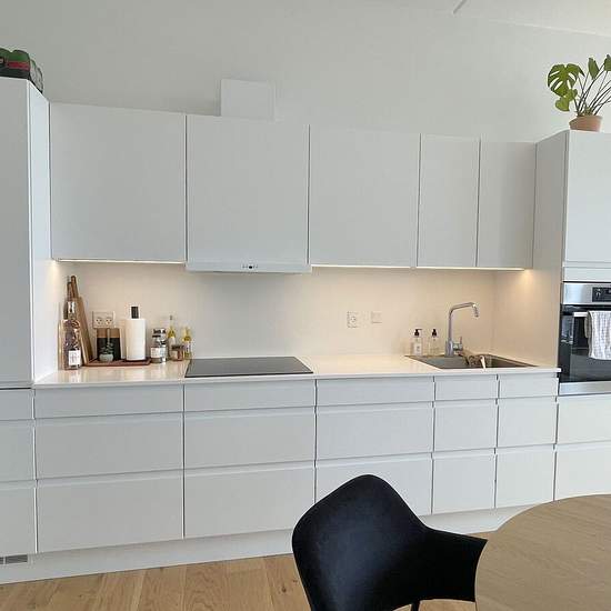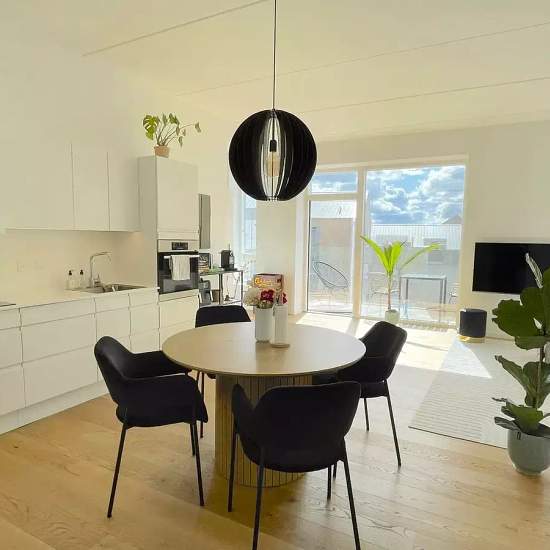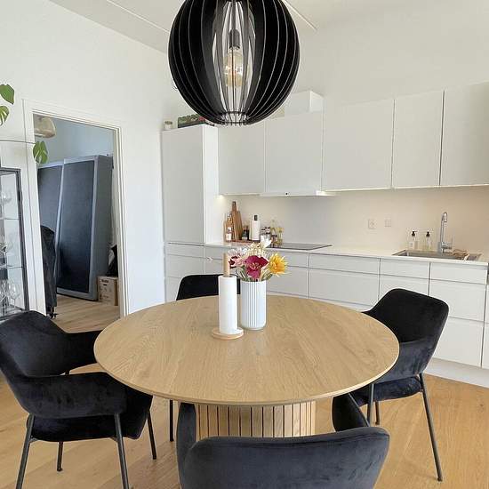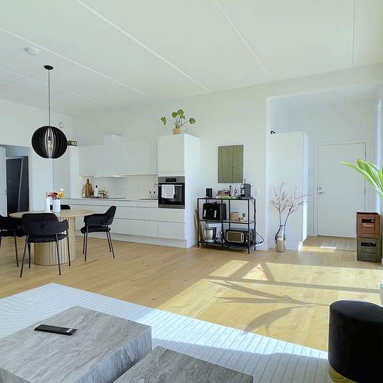 Når du træder ind i lejligheden, mødes du af det store og lyse køkken-alrum, hvor lyset strømmer ind gennem de store vinduespartier. Lejligheden er beliggende på øverste etage, så du får en fantastisk udsigt over Stigsparken, ejendommens hyggelige have, samt tagtoppene i horisonten. I køkkenet kan du glæde dig til at lave mad i det lækre grebsfrie HTH-køkken med Corian-bordplade og fuld AEG hvidevarepakke. Fra det store køkken-alrum har du udgang til den sydvendte altan, hvor du kan nyde de varme sommeraftener med grill og hyggelige stunder....
