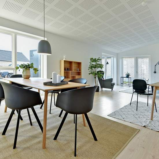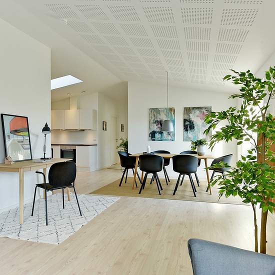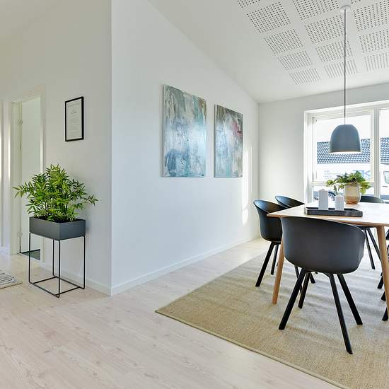 Dette skønne rækkehus tilbyder en fordelagtig værelsesfordeling, der er velegnet til både unge par, familier med børn, fraskilte med børn og seniorer. Boligens 120 kvadratmeter råder over tre separate værelser og et stort opholdsrum – alt sammen på ét plan. Husets hoveddør åbnes ind til boligens store, moderne bryggers, hvor der blandt andet er god plads til håndtering af vasketøj. Herfra føres I ud til det brede gangareal, hvorfra der er indgange til de fleste af boligens rum. På gangens venstre side foreligger to af værelserne, der begge...