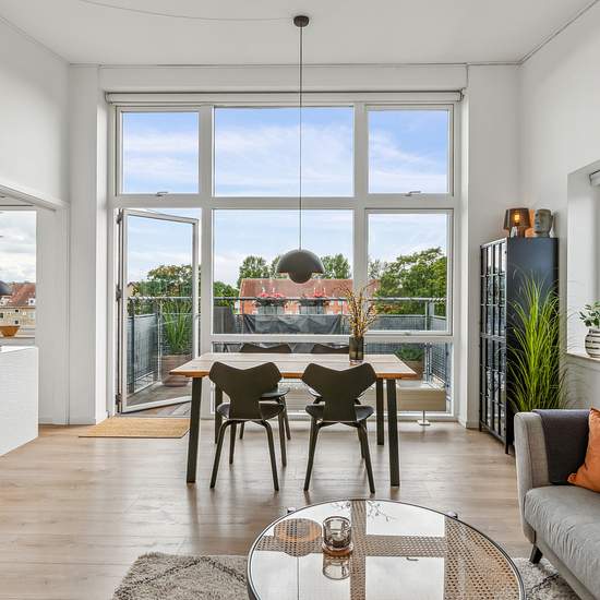 Bedst egnet til enlige lejere eller par. Lejligheden er attraktivt beliggende i en moderne ejendom med elevator, privat parkeringsplads, stort depotrum i kælder og en stor altan tilknyttet lejligheden. Lejligheden udlejes fuldt møbleret for en periode på op til 17 måneder. Man ankommer med elevator til øverste sal i ejendommen, hvor der er adgang til lejlighedens entre. Her er indbyggede skabe og god plads - og videre adgang til lejlighedens stuerum. Stuerummet er indrettet som både spise- og opholdsstue og har en fantastisk udsigt over næ...