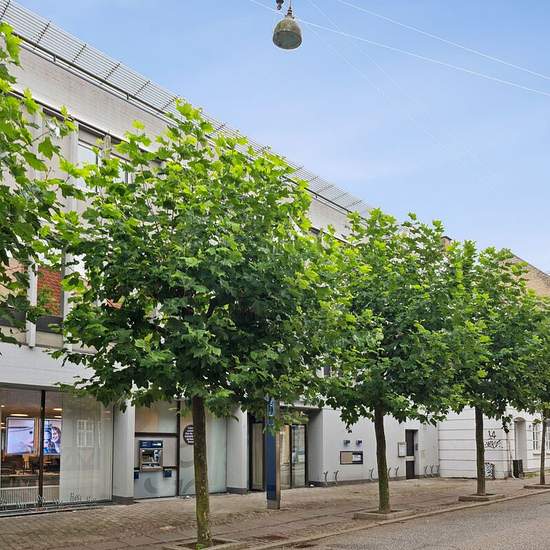 Helt ny renoveret bolig i den tidligere Danske Bank-bygning. Boligen er indindrettet med lyse og gedigne materialer. Du kommer ind i en entre, med adgang til et dejligt brusebadeværelse samt et depot. Videre ind i lejligheden er der et stor køkken/stue- alrum, og i den modsatte ende to værelser, et mindre værelse samt et stort værelse. Der er elevator i ejendommen, samt en stor fælles tagterasse.