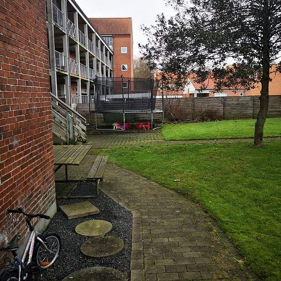 For English text, see below. Denne dejlige 2 værelses lejlighed består af en stue og et soveværelse, samt køkken og bad. Stuen er meget lys da det er en hjørnelejlighed. Der er en hyggelig gårdhave, og i forlængelse af gårdhaven er der en stor græsplæne med fine siddeområder og grill. Haven er fælles for alle beboere og man kan hygge sig samme i solen og tænde op i grillen på lune sommeraftener. Der er gode indkøbsmuligheder lige på den anden side af gaden, og lejligheden ligger tæt på midtbyen. Lejligheden ligger tæt på parken ved kultur...