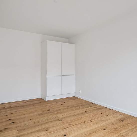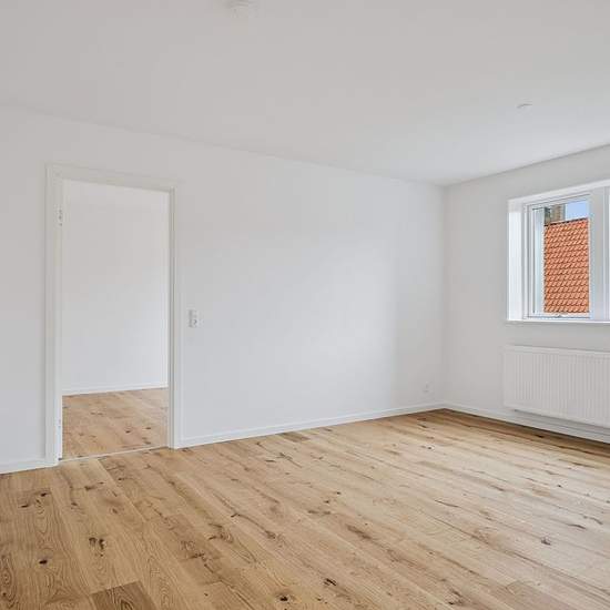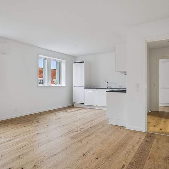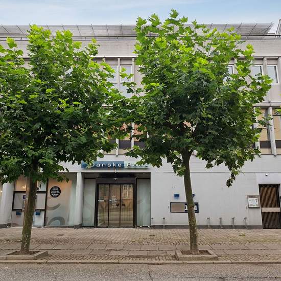 Helt ny renoveret bolig i den tidligere Danske Bank-bygning. Boligen er indindrettet med lyse og gedigne materialer. Du kommer ind i en entre, med adgang til et dejligt brusebadeværelse, et værelse samt et stort køkken/stue- alrum, og i den modsatte ende endnu et værelse. Der er elevator i ejendommen, samt en stor fælles tagterasse.