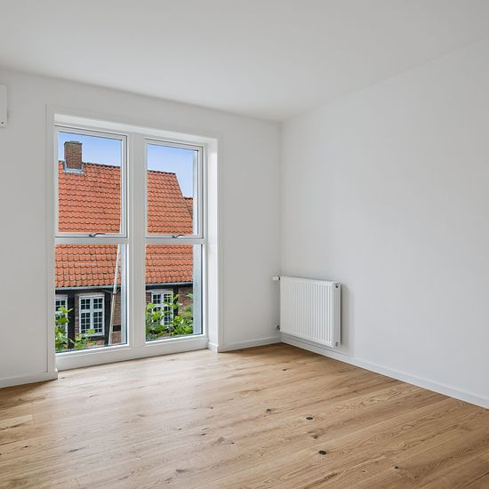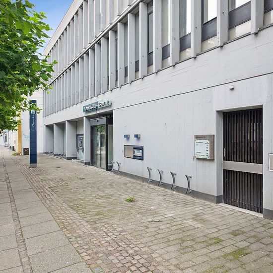 Helt ny renoveret bolig i den tidligere Danske Bank-bygning. Boligen er indindrettet med lyse og gedigne materialer. Du kommer ind i en entre, med adgang til et dejligt brusebadeværelse, et værelse samt et stort køkken/stue- alrum, og i den modsatte ende endnu et værelse. Der er elevator i ejendommen, samt en stor fælles tagterasse.