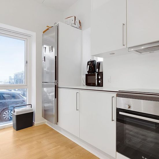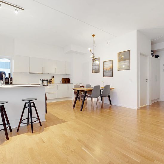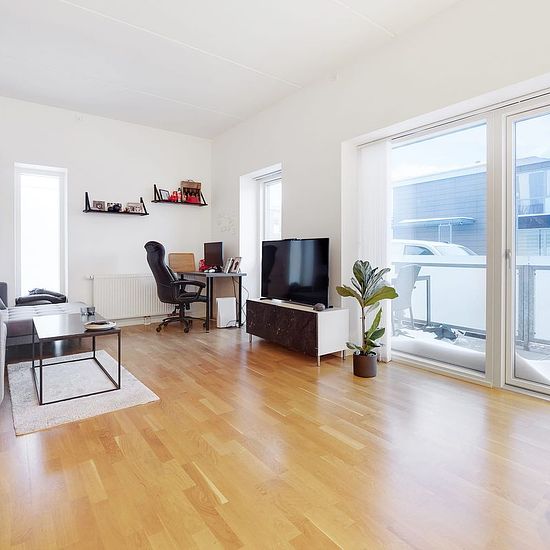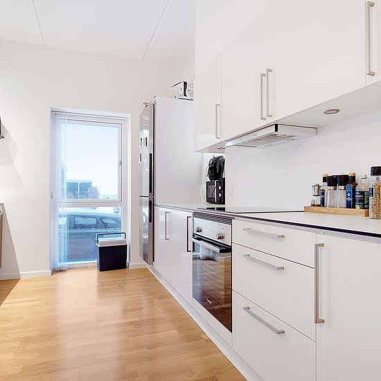 Træd ind i denne moderne 2-værelses bolig med et luftigt køkkenalrum, perfekt placeret på stueetagen.