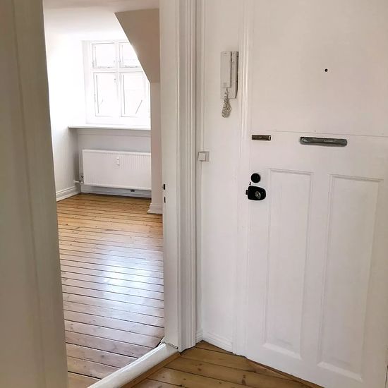 Velkommen til en velindrettet 2-værelses lejlighed på 47 m2 øverst i ejendommen. Her får du et lyst hjem med klassiske detaljer, pæne plankegulve og skråvægge, der skaber hyggelige kroge – ideelt til dig, der vil bo praktisk og charmerende på få, veludnyttede kvadratmeter. Lejligheden byder på en entré med plads til sko og overtøj og videre adgang til en regulær stue med flot lysindfald fra kvist. Her er god vægplads til både sofa, reol og et lille spisebord. Soveværelset er velproportioneret og rummer både seng og opbevaring; her finder du...