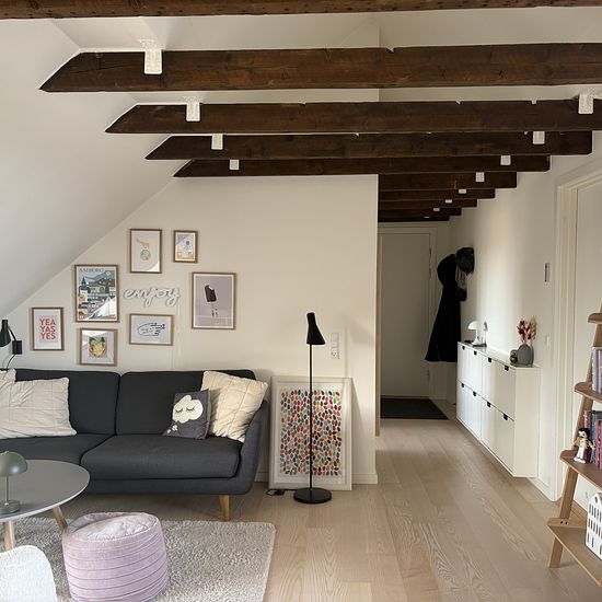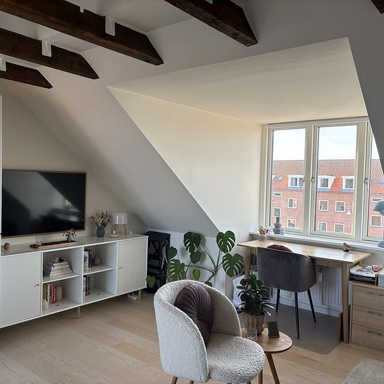 Velkommen til denne skønne og velindrettede 2-værelses lejlighed på 65 m², beliggende på 3. sal. Lejligheden byder på en lys og rummelig stue med flotte fritlagte bjælker og et dejligt lysindfald fra de store vinduer. Her er god plads til både sofa- og spiseområde samt direkte udgang til en stor terrasse — perfekt til afslapning, udeliv og hyggelige sommeraftener med udsigt over byens tage. Køkkenet fremstår moderne og funktionelt med god skabsplads og nødvendige hvidevarer. Soveværelset er roligt placeret med plads til dobbeltseng og opbe...