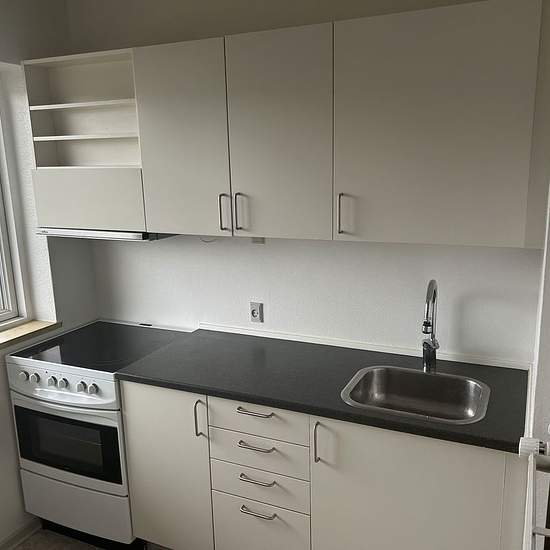 Velkommen til en indflytningsklar lejlighed med en praktisk planløsning, der gør hverdagen let for én person, et par eller den pendlende. Boligen byder på et lyst opholdsrum med stort vinduesparti, der giver et behageligt lysindfald og fint kig til det rolige nærmiljø. Stuen har plads til både sofa- og spiseområde, og de lyse trægulve skaber en indbydende ramme, der er nem at indrette personligt. Køkkenet er separat og holdt i et tidløst, hvidt udtryk med god bord- og skabsplads. Her er højt køle-/fryseskab, komfur med ovn og et praktisk vin...