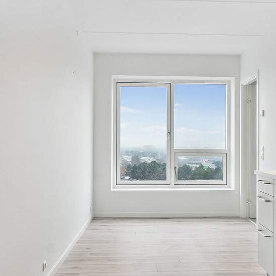 Boligen: Stor 2 værelses lejlighed, der indrettet med et godt alrum med flotte Pergo laminatgulve og store vinduespartier, der byder på et godt lysindfald til lejligheden og udsigt over området. I soveværelset er der et indbygget skab, og der vil derudover være plads til både seng og evt. ekstra opbevaring/skabe. Lejligheden er indrettet med et hvidt køkken fra Svane, med alt i hårde hvidevarer fra Electrolux. Badeværelset er rummeligt, holdt i grå klinker på gulvet, og hvide klinker i brusenichen, og dertil vil der være installeret en kom...