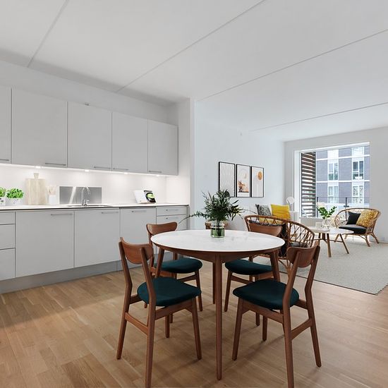 Denne fantastiske 4-værelses lejlighed, er rummelig og moderne. Lejligheden er beliggende i en bygning med højt til loftet, der giver en følelse af luftighed og elegance. Køkken-alrummet er det perfekte samlingspunkt for familie og venner. Det moderne køkken er udstyret med hvide fronter og stål håndtag, der giver det et stilfuldt og tidløst udseende. Køkkenbordpladen er hvid, hvilket skaber et rent og lyst udtryk. Der er masser af plads til at bevæge sig frit og skaber et åbent rum til madlavning, samvær og hygge. Det veludstyrede køkken ...