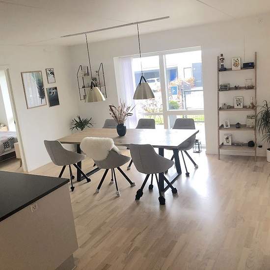 Velkommen til en moderne og rummelig lejlighed med en funktionel planløsning og et behageligt lysindfald. Her får du en indretning i lyse materialer med gennemgående trægulve, hvide vægge og store vinduespartier, der binder opholdsrum og udeliv naturligt sammen. Lejligheden byder på et stort og indbydende køkken-alrum, hvor hverdagen nemt udfolder sig. Det stilrene, hvide køkken har en rummelig ø/halvø med integreret vask, god bordplads og masser af opbevaring samt integrerede hårde hvidevarer – herunder opvaskemaskine, indbygningsovn og ind...