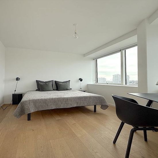 Denne lækre lejlighed findes på 7. sal, med en fantastisk udsigt over både Fælleden og Københavns Havn. Køkkenet og stuen er i åben forbindelse og gennemgående i lejligheden. Køkkendelen er rummelig og med et stort spiseafsnit. Der er ligeledes udgang til en stor terrasse. Lejligheden har tre soveværelser, alle tre med en skøn udsigt. Et af soveværelserne har direkte adgang til eget lækkert badeværelse. Der er yderligere et badeværelse med bruseniche og kombi vaskemaskine/tørretumbler. Der er elevator i ejendommen. Ejendommen ligger midt i ...