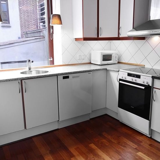 ~ Nyrenoveret toværelses lejlighed i Valdemarsgade ~ Lys fuldt møbleret lejlighed beliggende i kvarteret ved musikhuset, tæt ved ARoS Kunstmuseum og Aarhus Hovedbanegård. Lejligheden er indrettet med en åben entre med plads til sko og overtøj. Fra entreen er der adgang til køkken og badeværelse. Stuen ligger i forlængelse af køkkenet, de to rum adskilles af en halvvæg. Med vinduer i hver ende af rummet, er lejligheden lys og behagelig. Køkkenet har hvide skabe, lyse fliser og et vindue over køkkenvasken. Det er indrettet med opvaskemaskin...