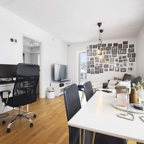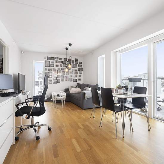 Nyd panoramaudsigten fra vores moderne 2-værelses lejlighed på 6. sal, hvor køkkenalrummet åbner op til en rummelig altan.