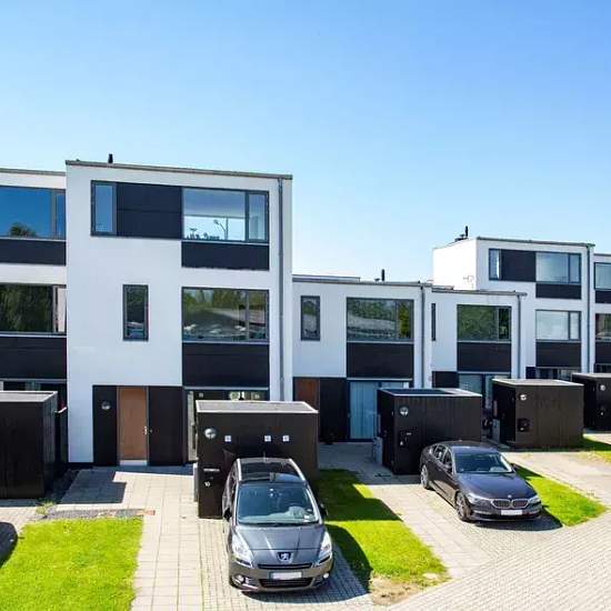 Lyst og moderne rækkehus med 143 velindrettede kvm og 5 værelser Velkommen til dette stilrene og indbydende rækkehus, hvor moderne arkitektur og funktionelle løsninger går hånd i hånd. Boligen byder på 143 veldisponerede kvadratmeter fordelt på 5 gode værelser – perfekt til familien, der ønsker både plads og komfort. Husets hjerte er det lyse opholdsrum i åben forbindelse med køkken og spiseplads. De store vinduespartier sikrer et fantastisk lysindfald og skaber en naturlig sammenhæng mellem inde og ude. Køkkenet fremstår moderne og minima...
