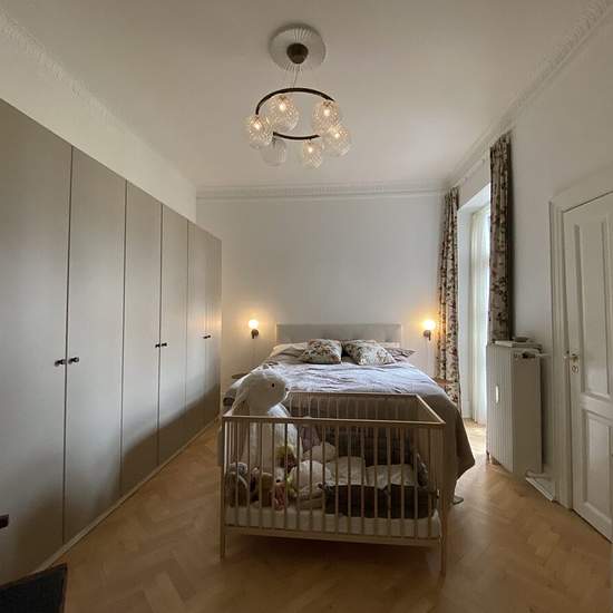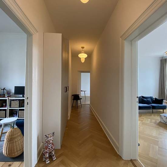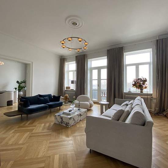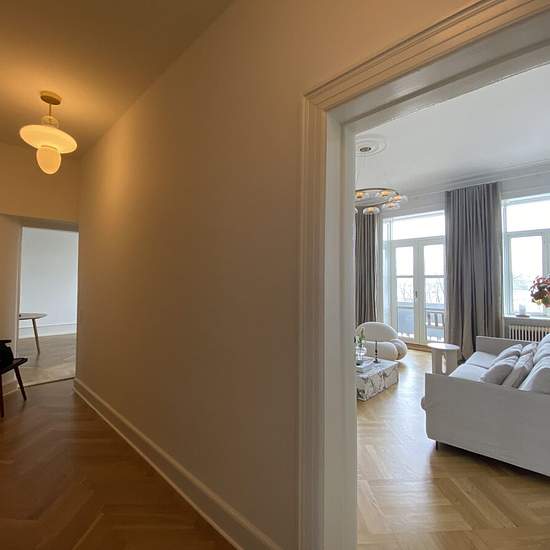 About This beautiful apartment has 5 rooms – 2 large living rooms and 3 bedrooms. There is a nice balcony from one of the living rooms. The apartment has a large refurbished bathroom and an extra guest toilet. The kitchen is also refurbished and has space for dining and access to a newly built balcony – in total 2 balconies in this apartment. There is an elevator directly to the entrance door. Please note, that the apartment is taken over without furniture, and the images are only inspiration.