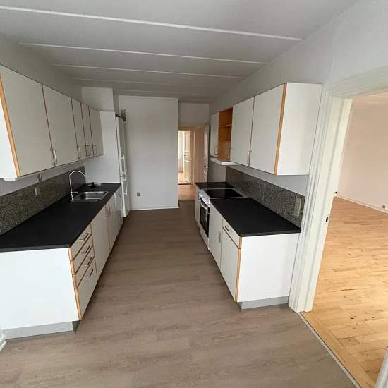 Stor 3. værelses lejlighed på 2. sal. Lejligheden indeholder stor entre/fordelingsgang, stor stue med udgang til egen terrasse, stort køkken hertil med plads til et lille spisebord, funktionel badeværelse samt 2 gode lyse værelser. Til lejligheden er der gode fælles forholde herunder; Parkering, fælles vaskeri samt eget depotrum. Ikke tilladt at holde husdyr. Hårde hvidevarer medfølger lejligheden