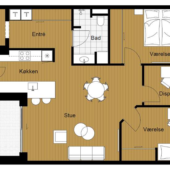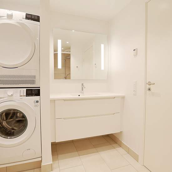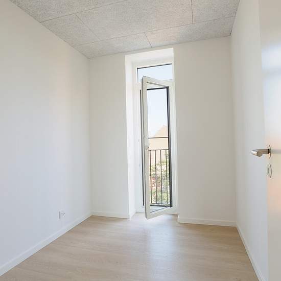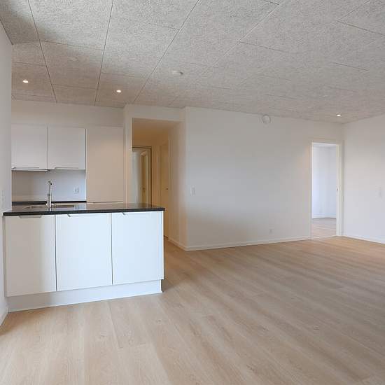 Denne rummelige og veldisponeret 4-værelses lejlighed er beliggende på 3. sal, med udsigt mod både nord og syd. Lejligheden indeholder en entré med indbyggede garderobeskabe, samt badeværelse med lyse klinker og gulvvarme, samt bruser, vaskeskab og vaskesøjle med nyeste energibesparende vaskemaskine og tørretumbler. Herudover forefindes en stor kombineret spise- og opholdsstue, som ligger i åben forbindelse med lejlighedens køkken. Køkkenet er med hvide skabslåger og Quooker installation og indeholder alt i integrerede hårde hvidevarer, her...