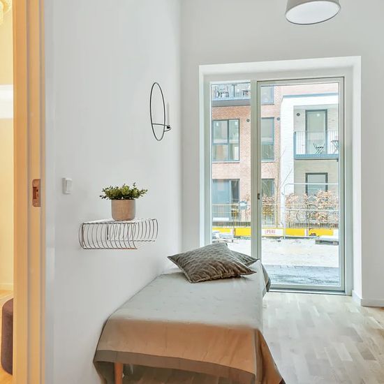 Velkommen til Brokvarteret i Aarhus K - en bydel der sprudler af kultur og kreativitet! Her i Karré C er der alt fra 1-værelses studiolejligheder til 4-værelses Townhouses - så der er plads til både den lille familie, kæresteparret eller vennerne, der drømmer om at bo tæt på både natur og kort afstand til Aarhus C. Det moderne køkken fra HTH har komplet hvidevarepakke fra Siemens og badeværelset er opført med stilrene fliser, væghængte elementer og gulvvarme. Den gennemgående lyse stil i lejligheden står i smuk kontrast til det gennemgåen...