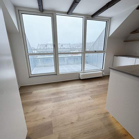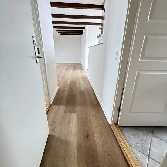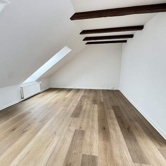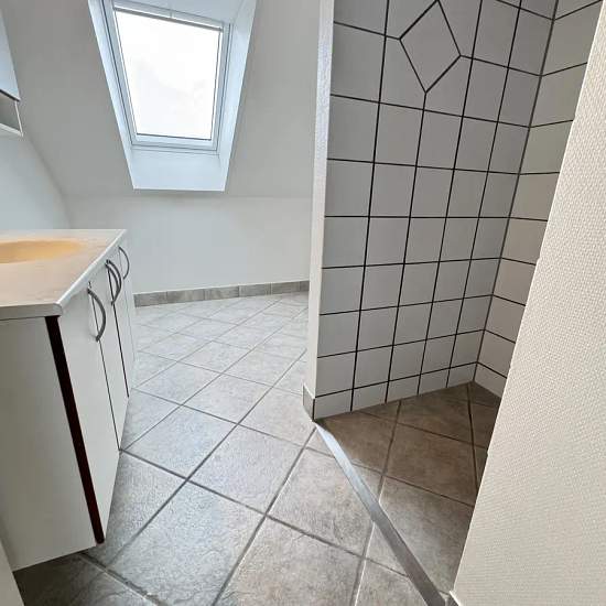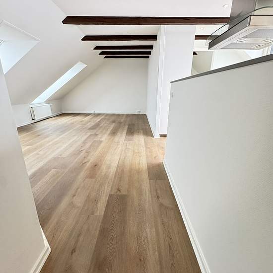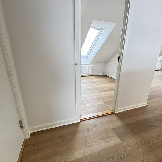Velkommen til denne nyrenoverede 3-værelses lejlighed på 76m2 med flotte fritliggende bjælker. Når du træder ind i entréen ligger badeværelset på højre hånd, hvor der er gulvvarme og mulighed for at tilslutte egen vaskemaskine og tørretumbler. På venstre hånd finder du lejlighedens første værelse med et skråvindue, der gør værelset dejligt lyst. Længere inde i lejligheden finder du køkken/alrummet, hvor man især ligger mærke til bjælkerne i loftet, som giver en helt speciel stemning i lejligheden. Alrummet er desuden udstyret med en hygge...