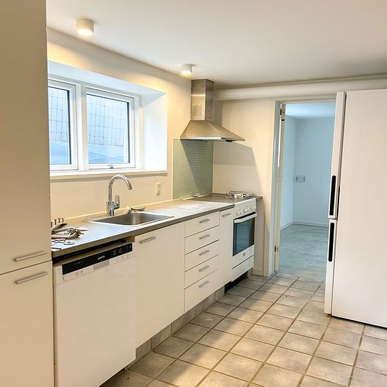 Centralt i Rønde udlejes denne flotte og nyrenoverede parterre-lejlighed, som fremstår lys, moderne og indflytningsklar. Lejligheden er godkendt til beboelse og ligger i en ejendom med 3 lejemål. Lejligheden byder på en god planløsning med entré, en stor og indbydende stue med parketgulv og god plads til både opholds- og spiseafdeling samt et rummeligt værelse med klinkegulv og indbyggede skabe. Badeværelset, hvortil der er adgang fra soveværelset, er praktisk opdelt i to sektioner med separat bruseafdeling på den ene side af indgangen og va...