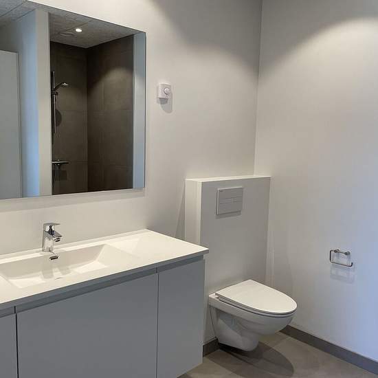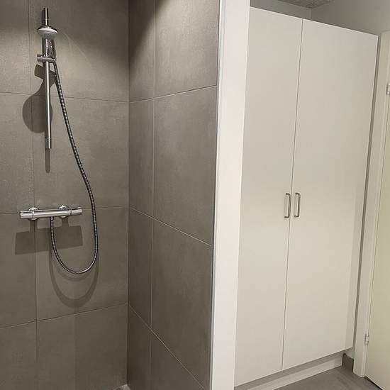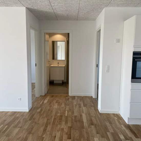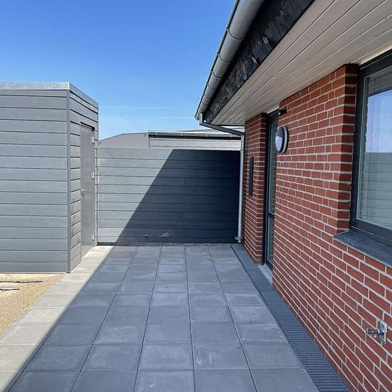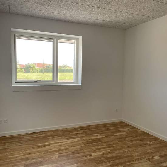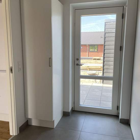 Rækkehuset indeholder entre med teknikskab og skab med plads til vaskesøjle (vaskemaskine og kondenstørretumbler). Køkken/alrum med hvidt grebsfrit køkken. Køkkenet indeholder opvaskemaskine, emhætte, ovn, kogeplader og køle-/fryseskab. Rækkehuset har to badeværelser med brus. Derudover har rækkehuset tre værelser med indbygningsskabe. Til rækkehuset er egen parkering i indkørslen, have med fliseterrasse, græsplæne og hæk. I forhaven er der egent skur. Med gulvvarme og ventilation i alle rum, sikres et behageligt og sundt indeklima. E...