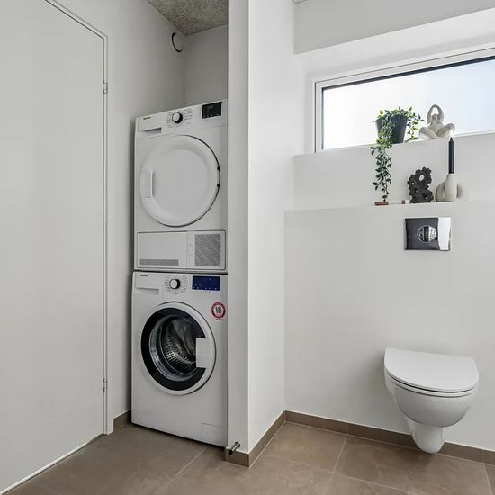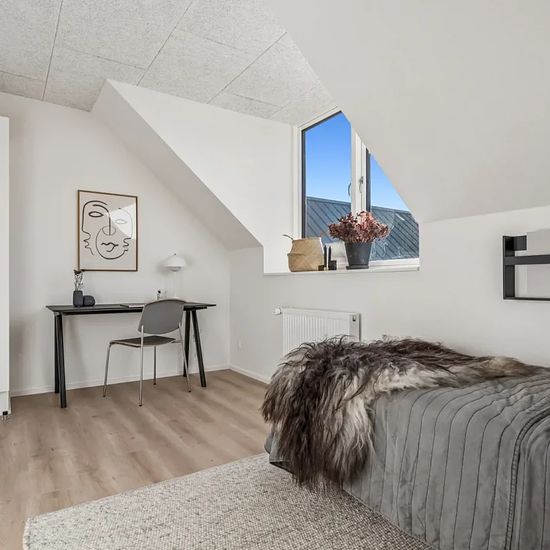 Når du træder ind i rækkehuset, mødes du af en entré. Herfra er der adgang videre ind i boligens opholdsrum. Stueplan er indrettet med køkken og stue i åben forbindelse. Køkkenet ligger praktisk placeret med god skabsplads og nødvendige hårde hvidevarer, og i forlængelse heraf er der plads til spisebord. Stuen har en god størrelse og kan indrettes med både sofaområde og spiseplads, alt efter behov. Fra opholdsrummet er der udgang til en terrasse. På stueplan finder du desuden et badeværelse. Via trappen kommer du op på førstesalen. Her fi...