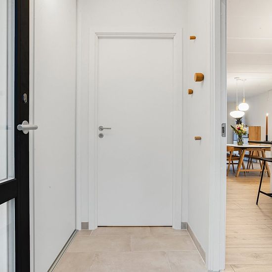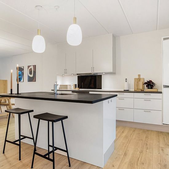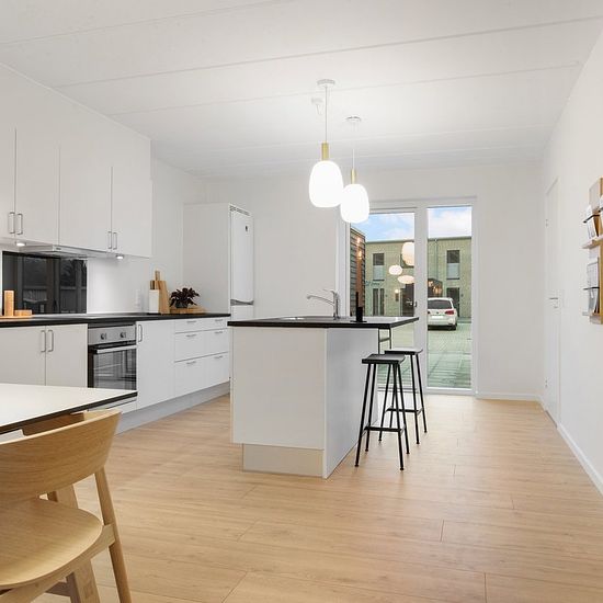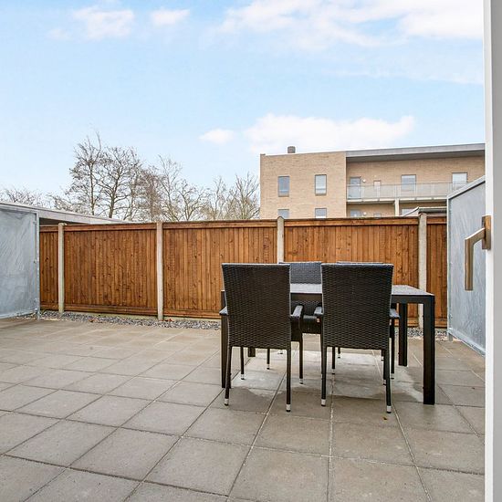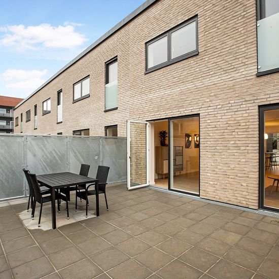 Nybygget rækkehus med egen sydvendt terrasse i Herning centrum. 100 meter til Sdr. Anlæg og under 800 meter til gågaden. Rækkehuset er designet i nordisk stil med fokus på lys og åbenhed i en god planløsning og indretning. Rækkehuset er i to plan. Det er tilladt at holde ét husdyr (hund eller kat).