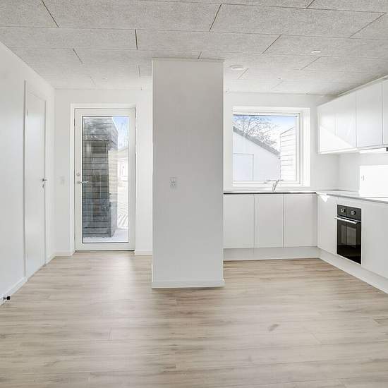 Rækkehus med terrasse. Boligen indeholder: Stue, køkken, toilet og på 1. sal toilet, to værelser og et mindre værelse/depot. Der er et skur med til boligen. Gulvvarme i stue etage og på badeværelse 1. sal. Luftrensende ventilationsanlæg for et godt indeklima. Der er gratis parkering ved boligen.