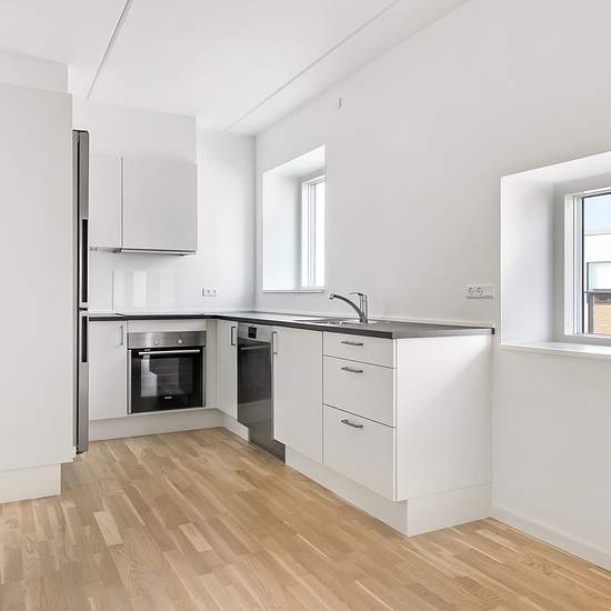 Lys og luft er nøgleordene for den samlede planløsning. Vinduerne er placeret, så beboerne får optimal udsigt ud over de attraktive, grønne områder og ind mod byen. Ejendommenes altaner er placeret, så de ikke skygger for hinanden, og alligevel giver beboerne maksimal privathed. Det grønne område mellem bebyggelserne binder det hele sammen og giver masser af udfoldelsesmuligheder i et stort fælles område, og så ligger Åbyskolen for øvrigt lige om hjørnet. De velindrettede 4-værelses lejligheder er indrettet med en stue i åben forbindelse med...