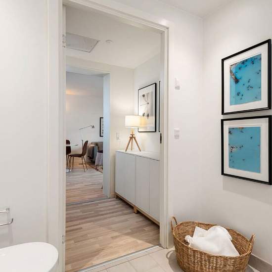 Om boligen: Med denne treværelses lejlighed, får du soveværelse, gæsteværelse/kontor, badeværelse og et moderne køkken med direkte forbindelse til stuen. På badeværelset er der gjort plads til en vaskesøjle, hvis du ønsker det, ligesom der også er en opvaskemaskine i køkkenet. Med en treværelses lejlighed kan du se frem til, at du fra dit soveværelse har udsigt over den skønne atriumhave. Og fra din stue kan du gå direkte ud på din egen private altan med en dybde på 3 meter. Udover det skønne udendørs areal får du også et større forareal med...