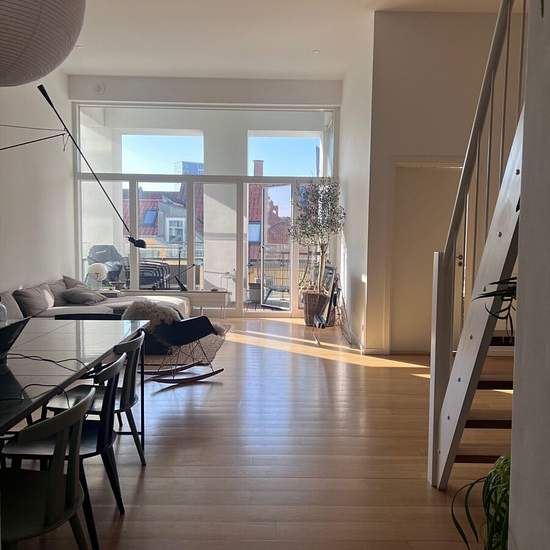 Er du/I til højt til loftet, rå mursten, masser af lys og andre fede detaljer, og så endda midt i Centrum af Aarhus, så se her: Lejligheden er beliggende tæt på Strøget, banegård og rutebilstation, Streetfood m.m., men alligevel i fred og ro. Her får man en spændende lejlighed med entré med skabe, adgang til brusebadeværelse med plads til vaskesøjle. Fra entré adgang til det flotte opholdsrum i åben forbindelse med køkken, stort vinduesparti fra gulv til loft, udgang til stor altan. Trappe til anvendelig hems. Lille disp. rum/kontor. Fint so...