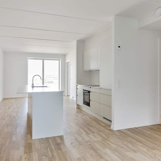 Bemærk; Billederne er ikke fra den pågældende bolig, men skal give et indtryk af stilen i boligen. Plantegningen er retvisende. Lejligheden er af moderne stil med flotte lyse rum. Med indgang til en rummelig entre indrettet med garderobeskab. Dertil et indbydende køkken-alrum med kombineret spise- og dagligstue, som fungerer som boligens naturlige samlingspunkt. Herfra er der udgang til boligen dejlige altan! Selve køkkenet er HTH i et moderne design, hvor køkkenøen samler rummet og inviterer til kulinariske udfoldelser og samvær. Køkkenet...