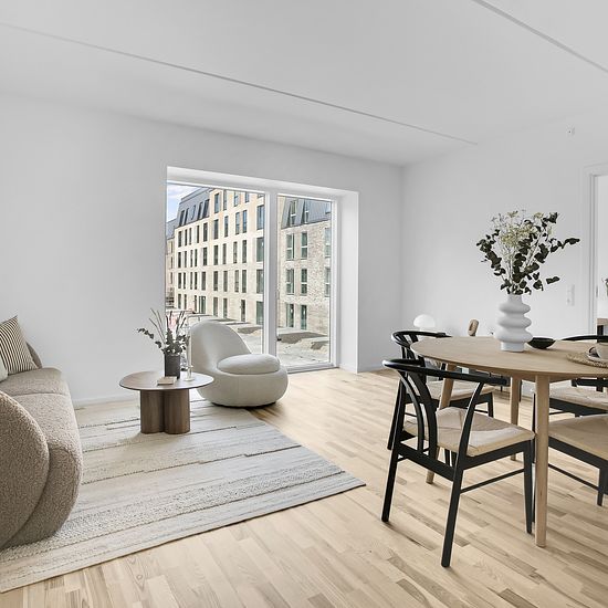 På 4. sal udbydes denne skønne og velindrettede lejlighed, som byder på en moderne planløsning og et dejligt lysindfald. Du træder ind i lejlighedens entré, hvorfra der er adgang til boligens centrale opholdsrum. På venstre hånd finder du det rummelige og indbydende køkken-alrum, som naturligt fungerer som hjemmets samlingspunkt. Her er der god plads til både spiseafdeling og opholdsstue, og de store vinduespartier sikrer et flot og behageligt lysindfald. Fra køkken-alrummet er der direkte udgang til lejlighedens private altan, hvor der er m...