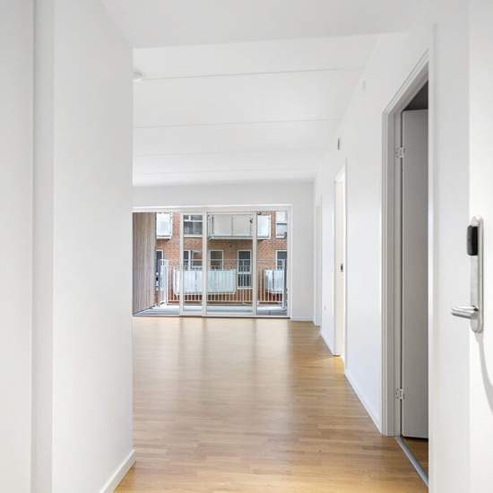 Denne lækre lejlighed er attraktivt beliggende i Jyllandsgade tæt ved Centrum, Kennedy Arkaden, togstationen, Kildeparken og meget mere. Det er en skøn 3’er på hele 84 m2. Lad tage tage et kig indenfor; Vi starter i den flotte og lyse opgang, hvor vi på en lidt doven dag kan tage elevatoren op. Her på 1. sal kommer vi ind i atriumgården og mødes af springvand, levende planter og fælles lounge inden vi kommer til selve lejligheden. Inde i lejligheden bydes vi velkomne i en fin lille entré med garderobeskabe, hvorfra vi træder ind i stuen. De...