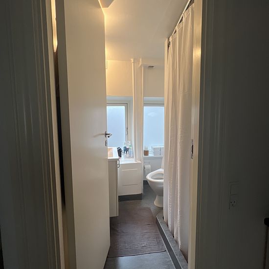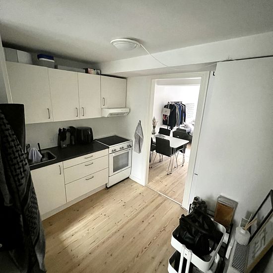 Hyggelig lille lejlighed med 100 m til stationen, 200 m til slotssøen og 200 m til gågaden. Lejligheden indeholder køkken med plads til vaskemaskine, som nuværende lejer har ladet stå, samt keramisk komfur, emhætte og køle/fryseskab. Der er et mindre badeværelse og stue/soveværelse i et. Der er mulighed for leje af P- plads i den aflåste gård.