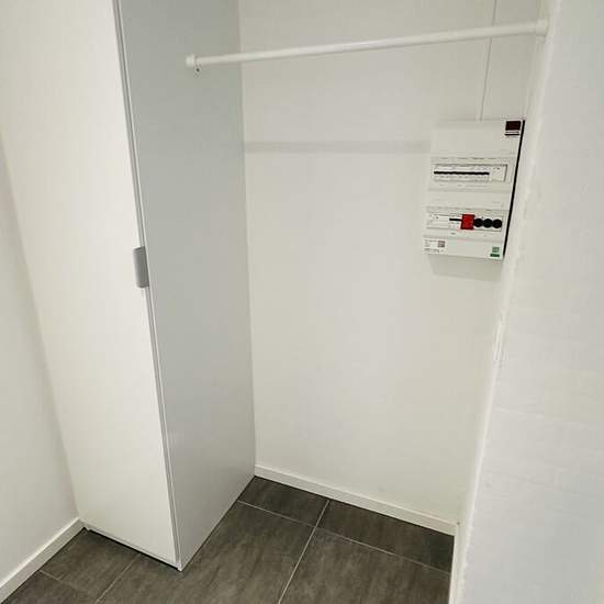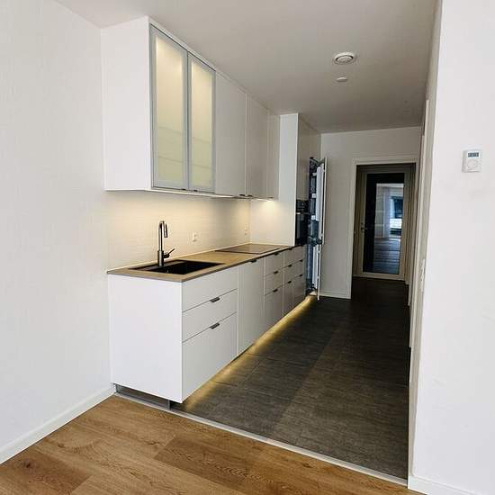 I lejlighedens entre er der indbygget garderobeskab til opbevaring, herfra er der adgang til badeværelset, hvor der er plads til opstilling af egen vaskemaskine og tørretumbler. Videre fra entreen går man ind i det flotte køkken som er i åben forbindelse, til den dejlige store stue som har fransk altan, herfra der kommer et rigtig godt lysindfald og der er mulighed for at nyde solens stråler. I lejlighedens soveværelse er der faste skabe med god plads til opbevaring, samt endnu en fransk altan. Lejlighedens flotte køkken med stenbordplade,...