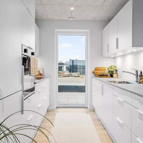 Velkommen til dit nye hjem i et moderne étplansbyggeri med egen privat have og terrasse. Rækkehusene er opført med fokus på høj kvalitet, funktionalitet og lavt energiforbrug. Du træder ind i en rummelig entré med god plads til overtøj og sko, og fortsætter videre til den store åbne stue og køkken-alrum. Her finder du alle nødvendige hårde hvidevarer, inklusive integreret opvaskemaskine, samt køle/fryseskab. De elegante, hvide Svane-skabselementer og de flotte laminatgulve understøtter det stilrene design, og gulvvarmen i alle rum sikrer en...