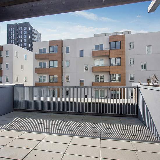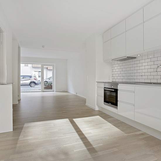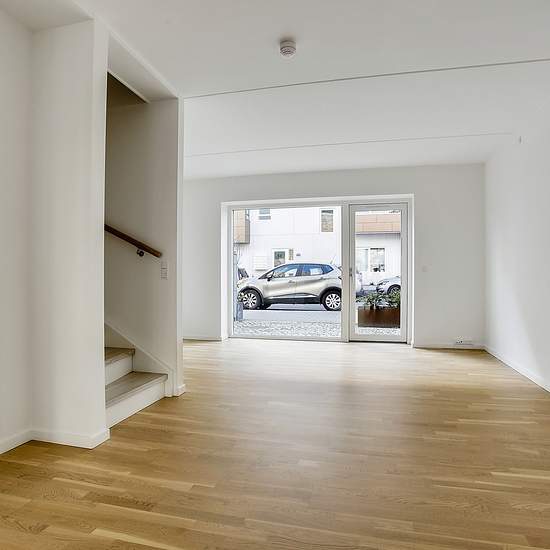 Dette skønne, moderne rækkehus på 106 m² er opført i tre rummelige etager og byder på både terrasse i stueplan og en privat tagterrasse på 2. sal. Hoveddøren åbner op til et velplaceret indgangsparti, og der medfølger én parkeringsplads på Krimsvej, som er inkluderet i lejen. Der findes også både legeplads og affaldsstation på ejendommen. Stueplan byder på en kompakt entré, der åbner op til det centrale opholdsrum. Et lyst, åbent køkken i forlængelse af stuen. Her ligger også det ene af husets to badeværelser, som er kombineret med et brygg...