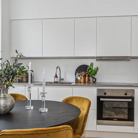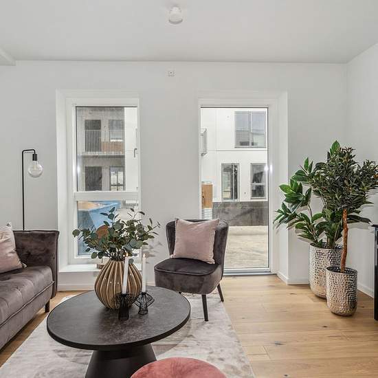 Om boligen: Denne moderne tre-værelses bolig rummer to store soveværelser med indbyggede skabe, et stort badeværelse samt en lys og indbydende stue. Køkken-alrummet er boligens hjerte og indbyder til hyggelige stunder. Fra stuen har man desuden adgang til en privat terrasse, hvor de store vinduespartier lukker masser af lys ind. Boligen er opført i kvalitetsmaterialer med egetræsgulve og gulvvarme, et stilrent hvidt HTH-køkken med integrerede Siemens-hvidevarer samt et badeværelse med vaskesøjle og elegante mørkegrå fliser. Om ejendommen: Fa...