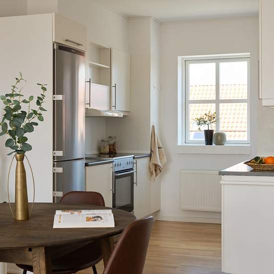 Lejemålet Lige nu udlejes denne rummelige og velindrettede 3-værelses lejlighed på 90 m2 med køkken i åben forbindelse med en stor stue. Køkkenet er fra Tvis og udstyret med hårde hvidevarer i form af komfur, opvaskemaskine, køle/fryseskab samt emhætte. Fra stuen er der udgang til boligens have, hvor du kan trække frisk luft i grønne omgivelser. Lejligheden har ydermere to gode værelser med skabe samt et stort badeværelse, hvor der både er gulvvarme og plads til at installere egen vaskemaskine og tørretumbler. Denne bolig er perfekt til dig...