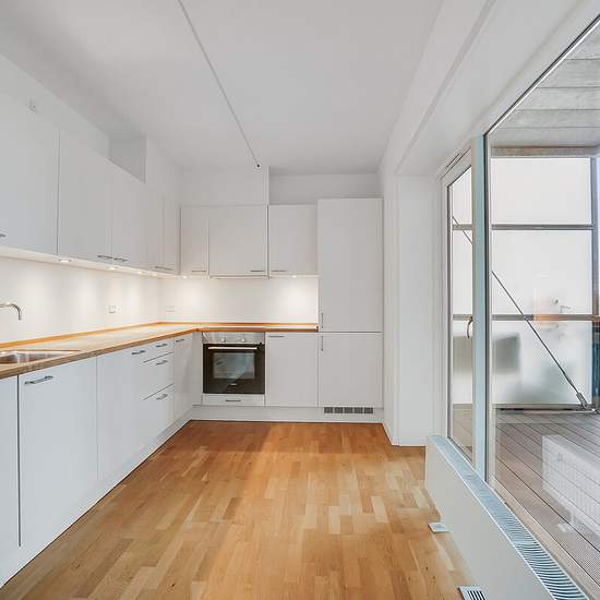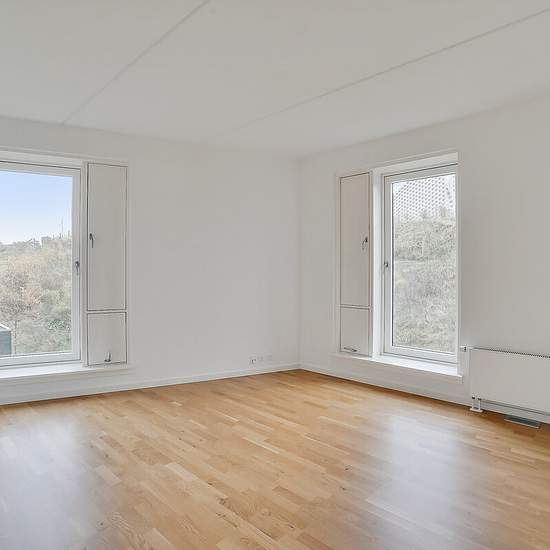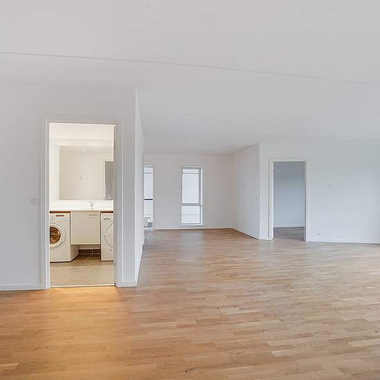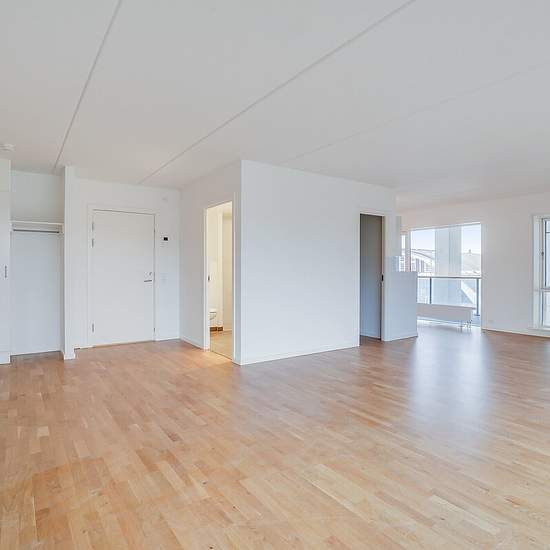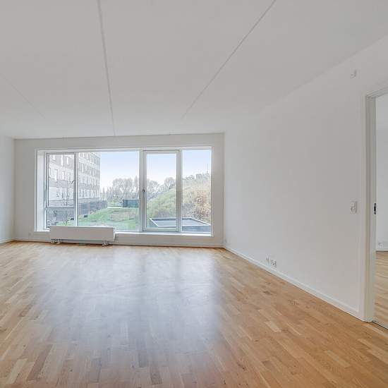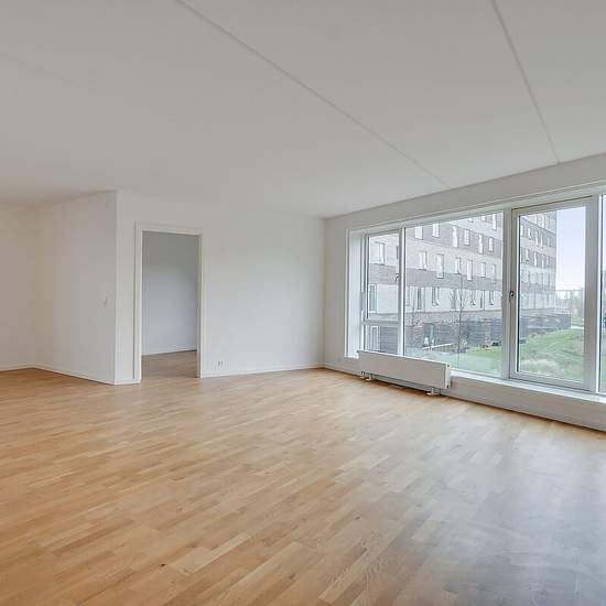 Denne skønne store 4-værelses lejlighed er placeret på 1. sal. Lejligheden byder på en entre med god plads til opbevaring, herfra er det ingang til 2 af boligens værelser, badeværelse med vaskemaskine, tørretumbler og seperat brus. Videre ind i lejligheden er den store stue, heraf åben adgang til boligens åbne køkkent, som også har direkte videre adgang til altanen. Boligen sidste værelse er placeret i hjørnet af stuen. Alle lejligheder er meget indbydende med lyse egetræsgulve og hvide vægge. Boligerne har flotte Invita køkkener og er udsty...