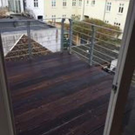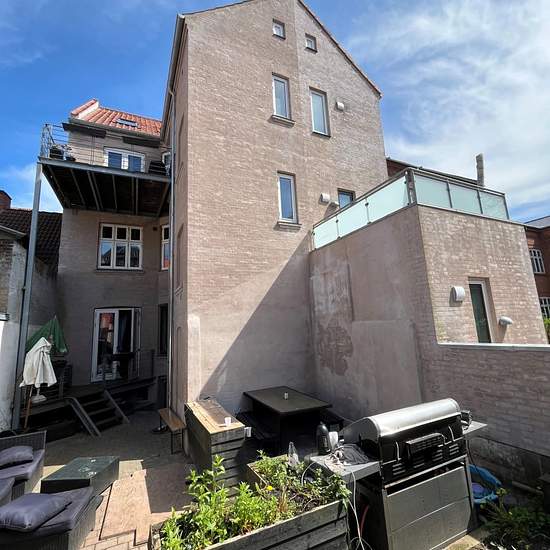 Stor og nyere 5-værelses lejlighed (heraf to stuer + tre værelser) beliggende i midtbyen på 2. og 3. sal i ejendom med kun 2 lejemål. Lejligheden har stor altan mod vest hvor der er sol det meste af dagen. Køkken, stuer og badeværelse befinder sig på nederste etage i lejligheden. De tre værelser samt toilet er på øverste etage. Der kan gives tilladelse til bestemte husdyr, dog ikke alle typer og IKKE kat.