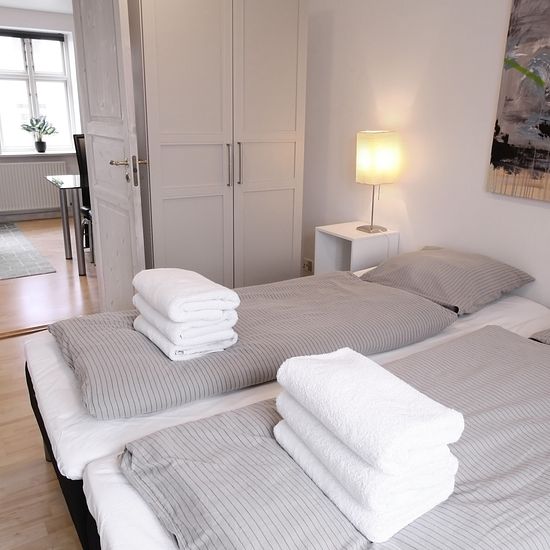 Hyggelig toværelses lejlighed i centrum af Aarhus. Den flotte og indbydende lejlighed er indrettet med en sofa og et sofabord, samt et spisebord med plads til fire personer. I stuen finder du også et fladskærms TV med mulighed for at streame. Køkkenet i lejligheden har hvide skabe, et vindue over vasken og hvide fliser over køkkenbordet for let rengøring. Køkkenet har kogeplader, mikroovn, varmluftsovn samt køle/fryseskab og alt i service. Soveværelset er indrettet med to enkeltsenge, natborde og et skab med bøjlestang og hylder. Badevær...