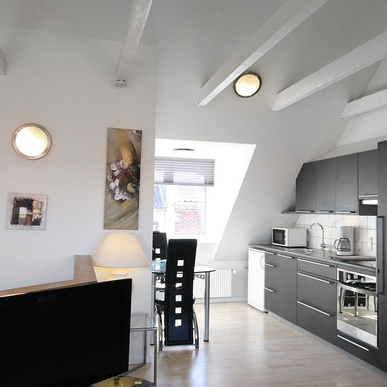 ~ Skøn og lys toværelses taglejlighed beliggende midt i Aarhus centrum ~ Lejligheden er placeret i 2. række fra gaden, med indgang fra en mindre gårdhave. Fra entreen er der egen trappeopgang til køkken, stue, soveværelse og badeværelse. Stuen er indrettet med sofa, lænestol, skrivebord og fladskærms TV. Soveværelset har 2 enkeltsenge og klædeskab. Derudover er der gode store skabe med megen skabsplads i entréen. Det moderne køkken er indrettet med rummelige køkkenskabe og lyse fliser over bordet. Dertil kommer mikrobølgeovn, køleskab med f...