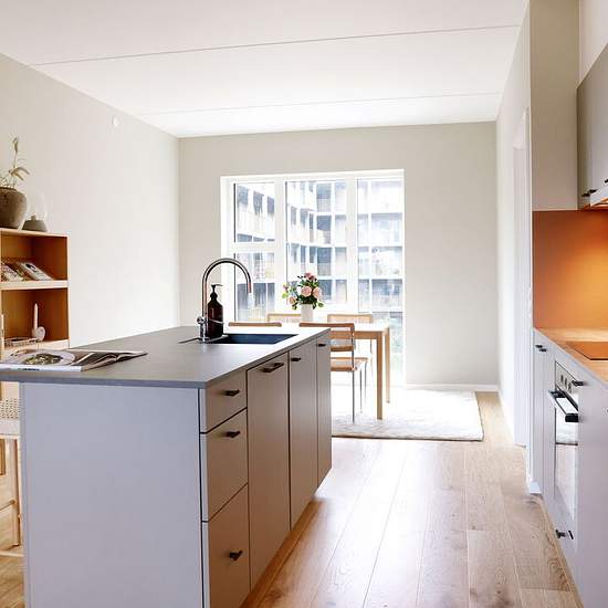 Om boligen: Boligen er lys, velindrettet 4-værelses lejlighed, med en god optimeret planløsning, der rummer et fint åbent køkken-alrum med plads til både spiseafdeling samt hyggeligt stueområde, og 3 gode soveværelser. Boligen har store vinduespartier, der inviterer dagslys og den fantastiske natur indenfor samt flotte egetræsparketgulve og gulvvarme. Fra køkken-alrummet er der udgang til en fin altan, hvorfra man kan nyde den fantastiske udsigt til søen og Fælledens smukke natur. Det smukke lyse køkken er fra Rotpunkt er holdt i en varm grå...
